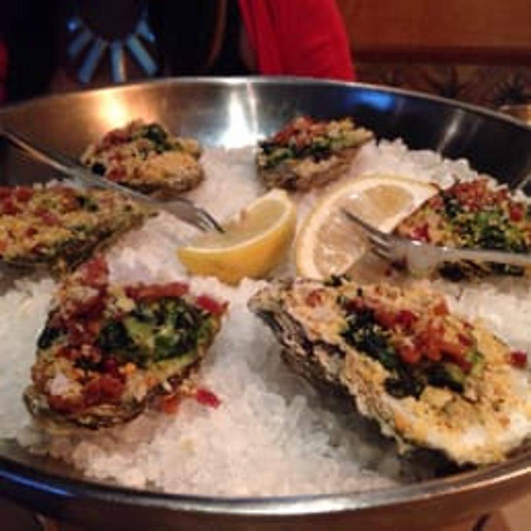 A classic and decadent appetizer featuring fresh oysters on the half shell, baked with a rich topping typically made of finely chopped spinach, herbs like parsley and tarragon, a hint of anise liqueur, and often breadcrumbs or a creamy sauce, creating a savory and luxurious bite.