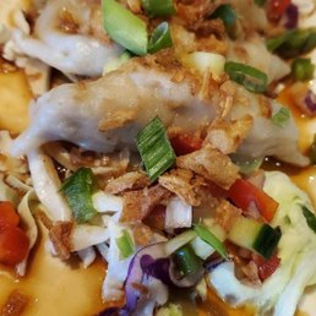 Six pan-seared Wagyu beef and ginger dumplings, prepared with crisp cabbage, pickled mango, topped with sesame seeds, and drizzled with soy sauce.