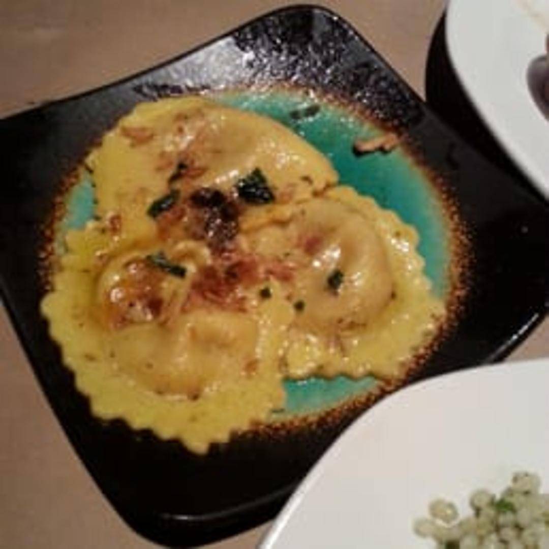 Butternut squash and ricotta filled ravioli, pan-seared and topped with brown butter and sage sauce, crumbled ricotta salata and toasted pumpkin seeds.