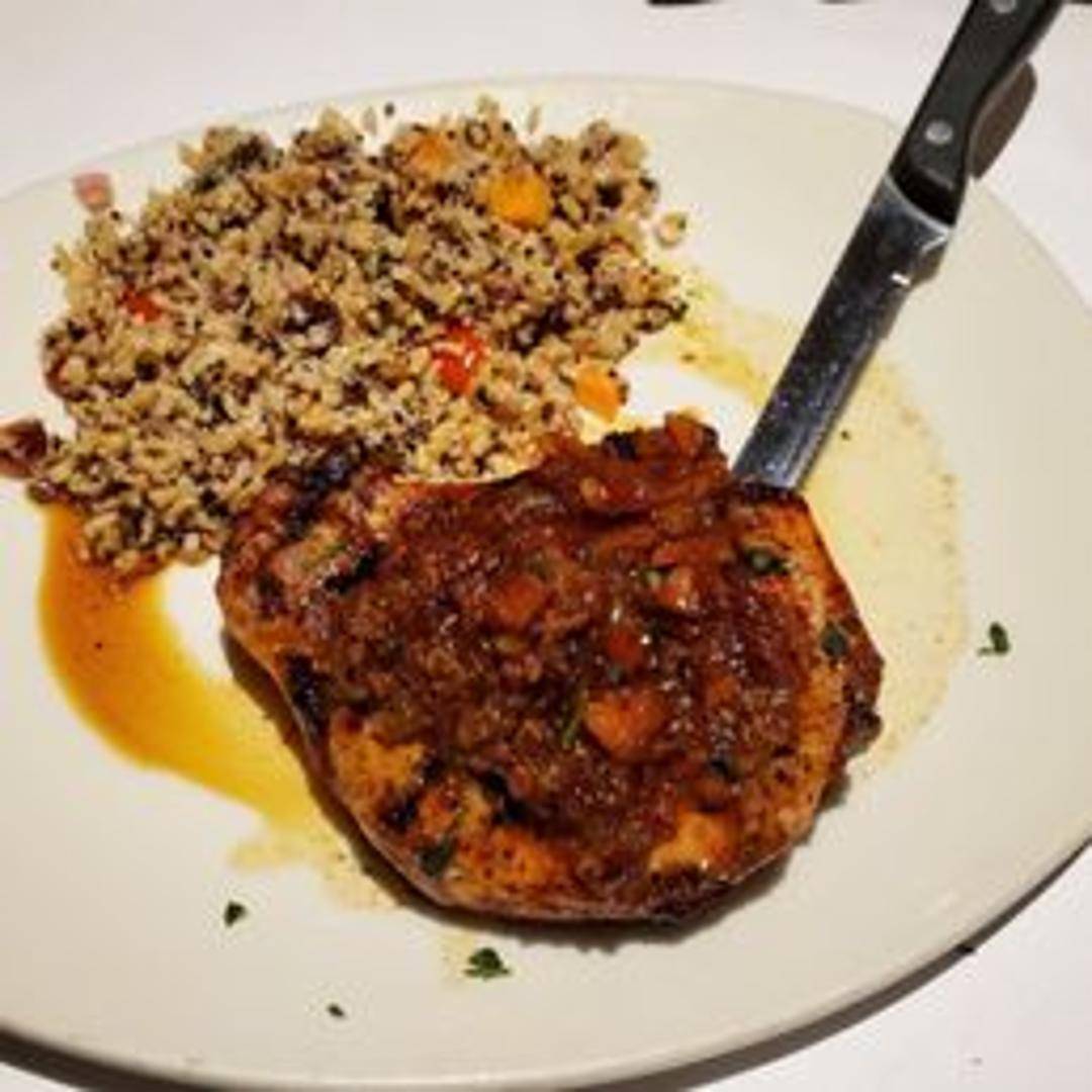 7 oz wood-grilled pork chop topped with a bourbon brown sugar glaze, served with choice of two sides.