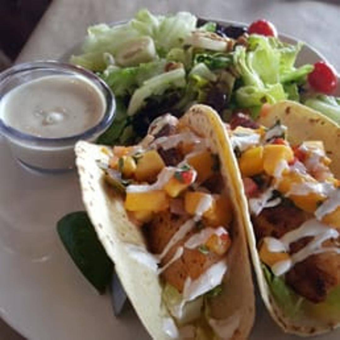 Three blackened fish tacos topped with mango salsa, shredded cabbage, lime crema, and cilantro. Served with your choice of side.