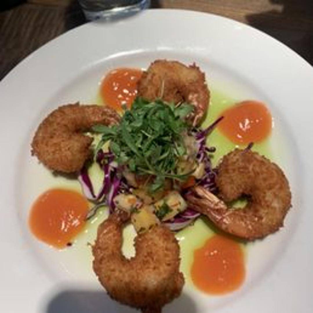 Crispy and golden-brown shrimp coated in shredded coconut, served with a sweet and tangy dipping sauce.