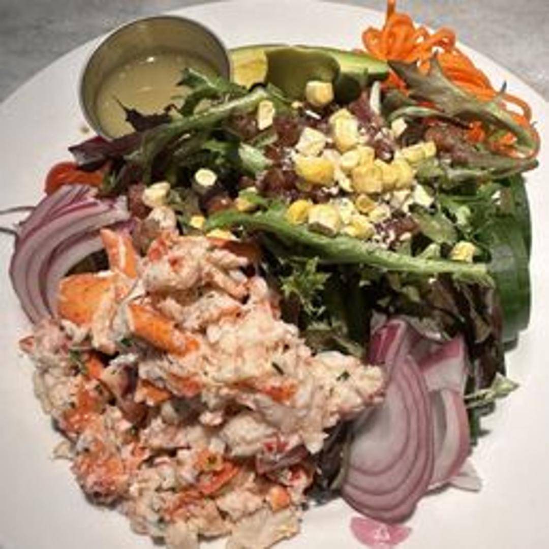 A luxurious twist on the classic Cobb salad, featuring fresh lobster meat, avocado, bacon, blue cheese, tomato, and hard-boiled egg, arranged artfully on a bed of crisp lettuce with your choice of dressing.