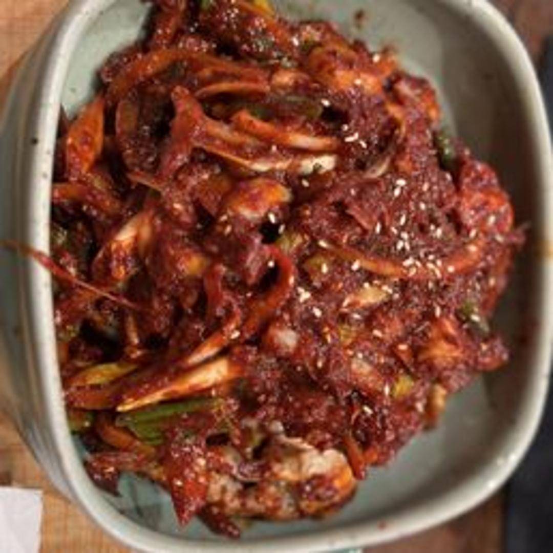 Fresh raw crabs marinated in a spicy and savory gochujang-based sauce. A popular Korean delicacy known for its intense flavor and addictive quality. Consume with caution due to spiciness.