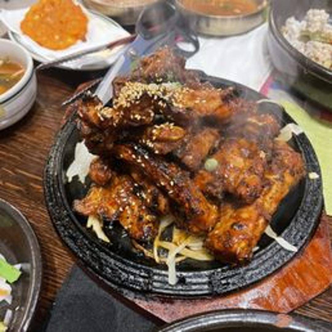 Tender and flavorful pork ribs, prepared in a Korean style. Often braised or simmered in a savory and slightly sweet sauce, featuring ingredients like soy sauce, garlic, ginger, and sesame oil. The meat is cooked until it's falling off the bone. Served with a rich, flavorful sauce.