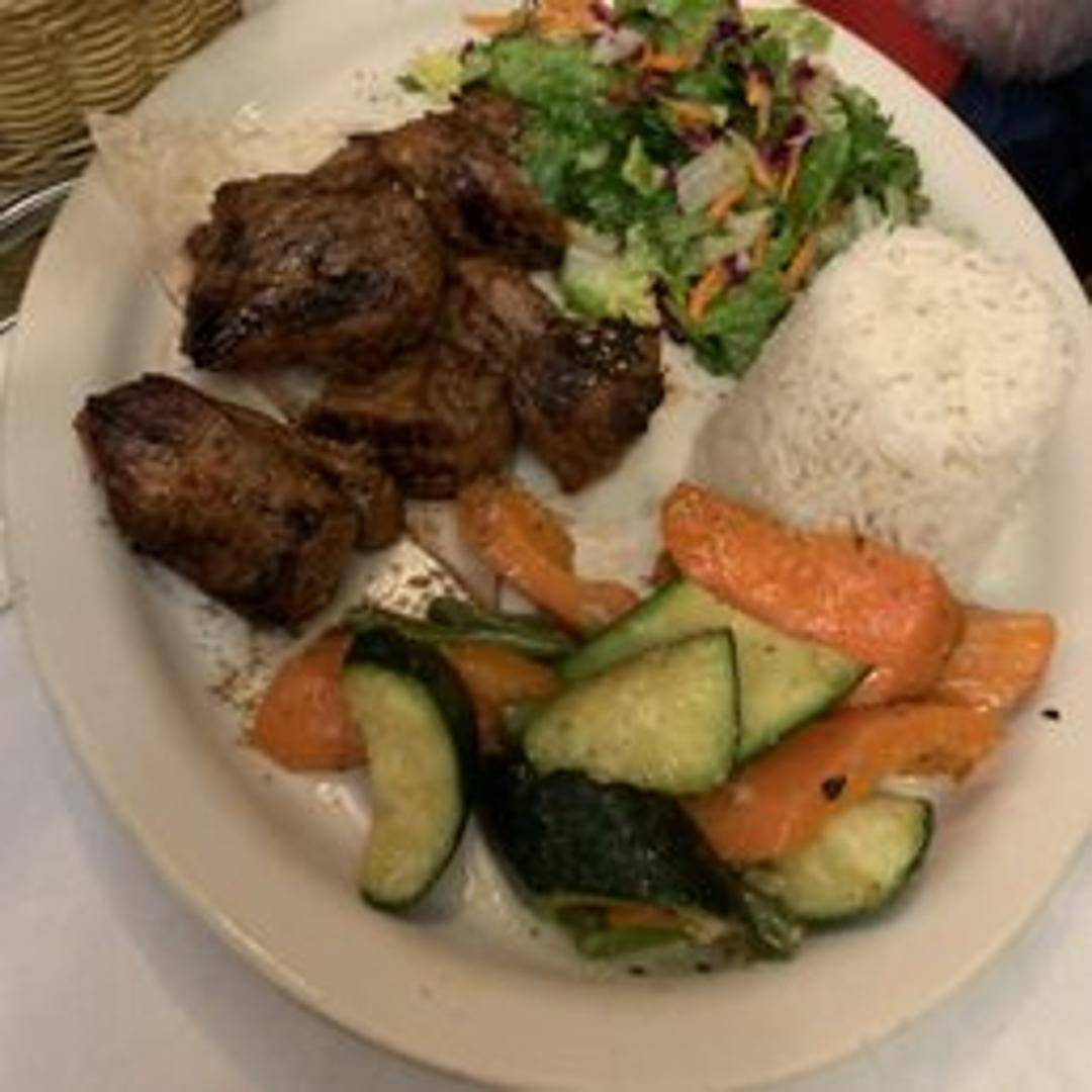 Succulent cubes of marinated meat (typically lamb or beef) grilled to perfection on a skewer, often interspersed with colorful vegetables like bell peppers, onions, and tomatoes. Seasoned with traditional spices and herbs, served with a side of rice or bread.
