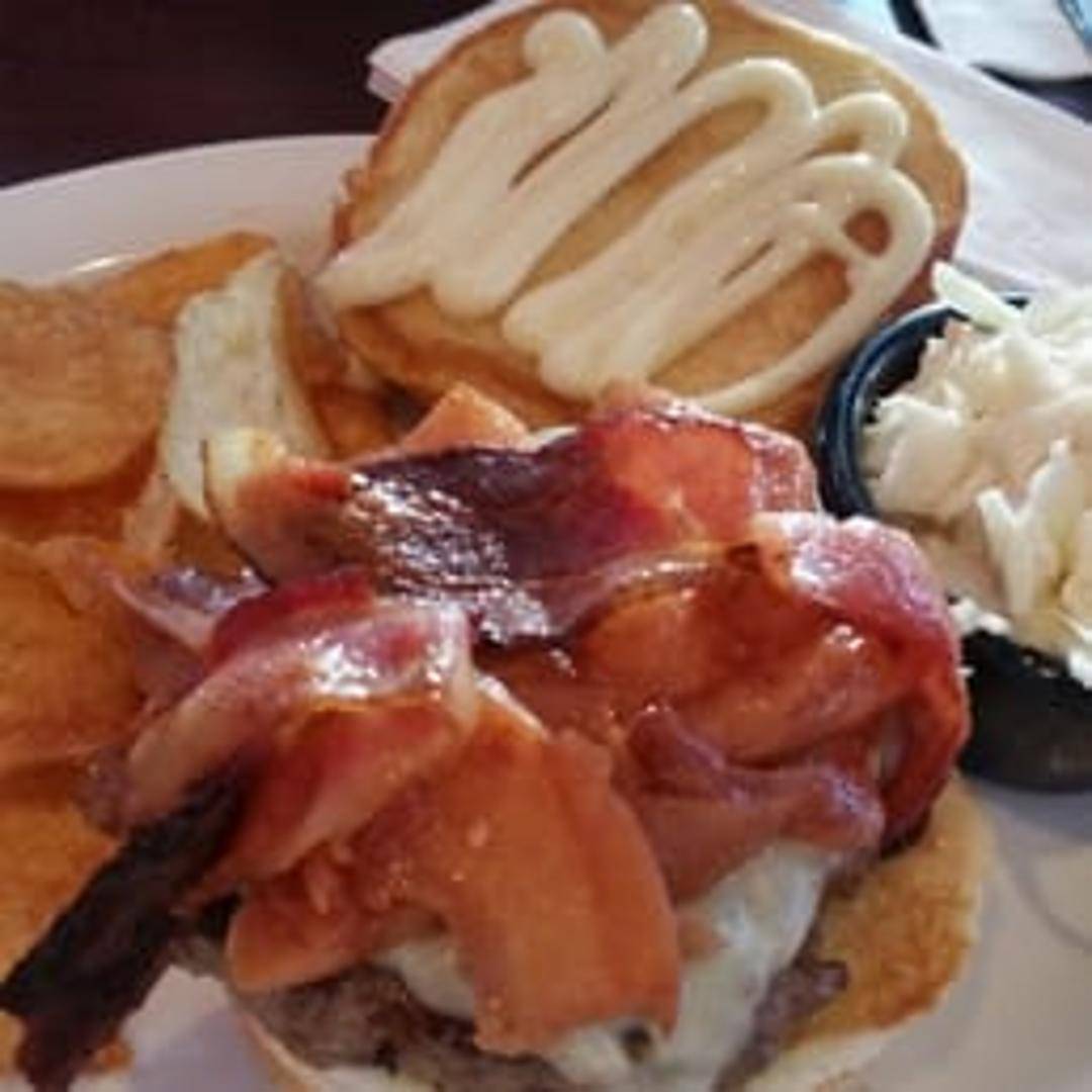 A massive burger featuring cheddar and jack cheeses, bacon, maple mayo, and apple slices, all stacked on a toasted bun.