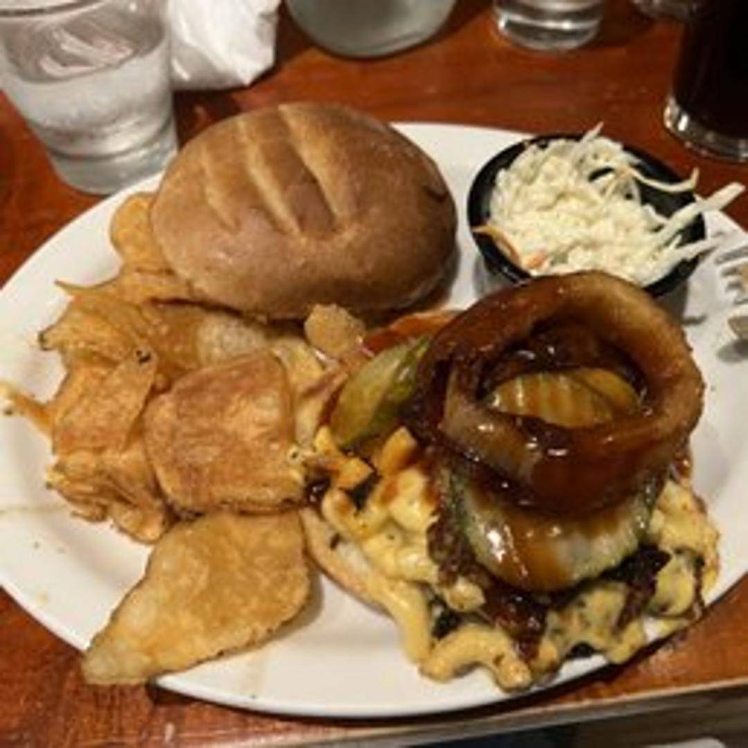 A juicy burger topped with crispy bacon, cheddar cheese, whiskey BBQ sauce, and crispy fried onion strings.