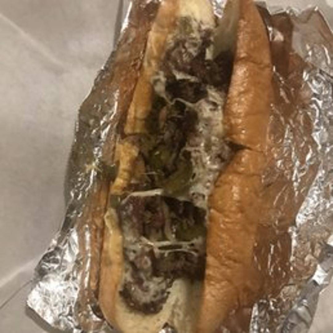 A pizza featuring thinly sliced steak, onions, mushrooms, and a blend of cheeses.