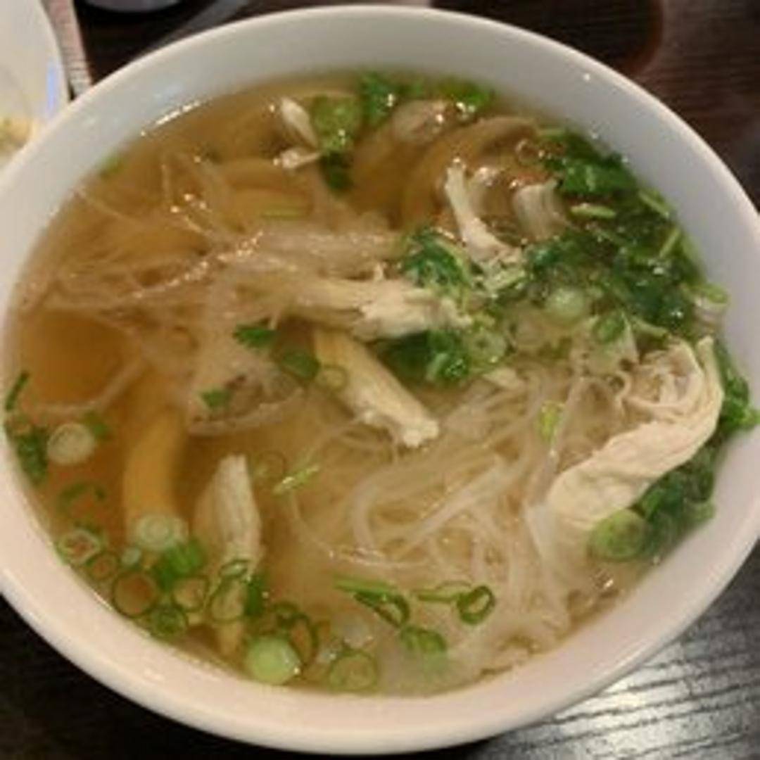 A comforting pho featuring tender slices of white meat chicken in a flavorful broth. Served with rice noodles, bean sprouts, fresh herbs, and lime.