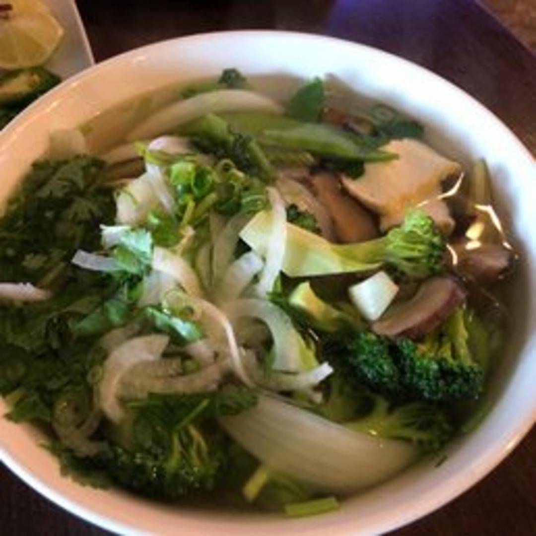A delicious and comforting pho featuring a savory vegetable broth, rice noodles, tofu, and a medley of fresh vegetables. Served with bean sprouts, fresh herbs, and lime. (Specify if you want mushroom broth.)