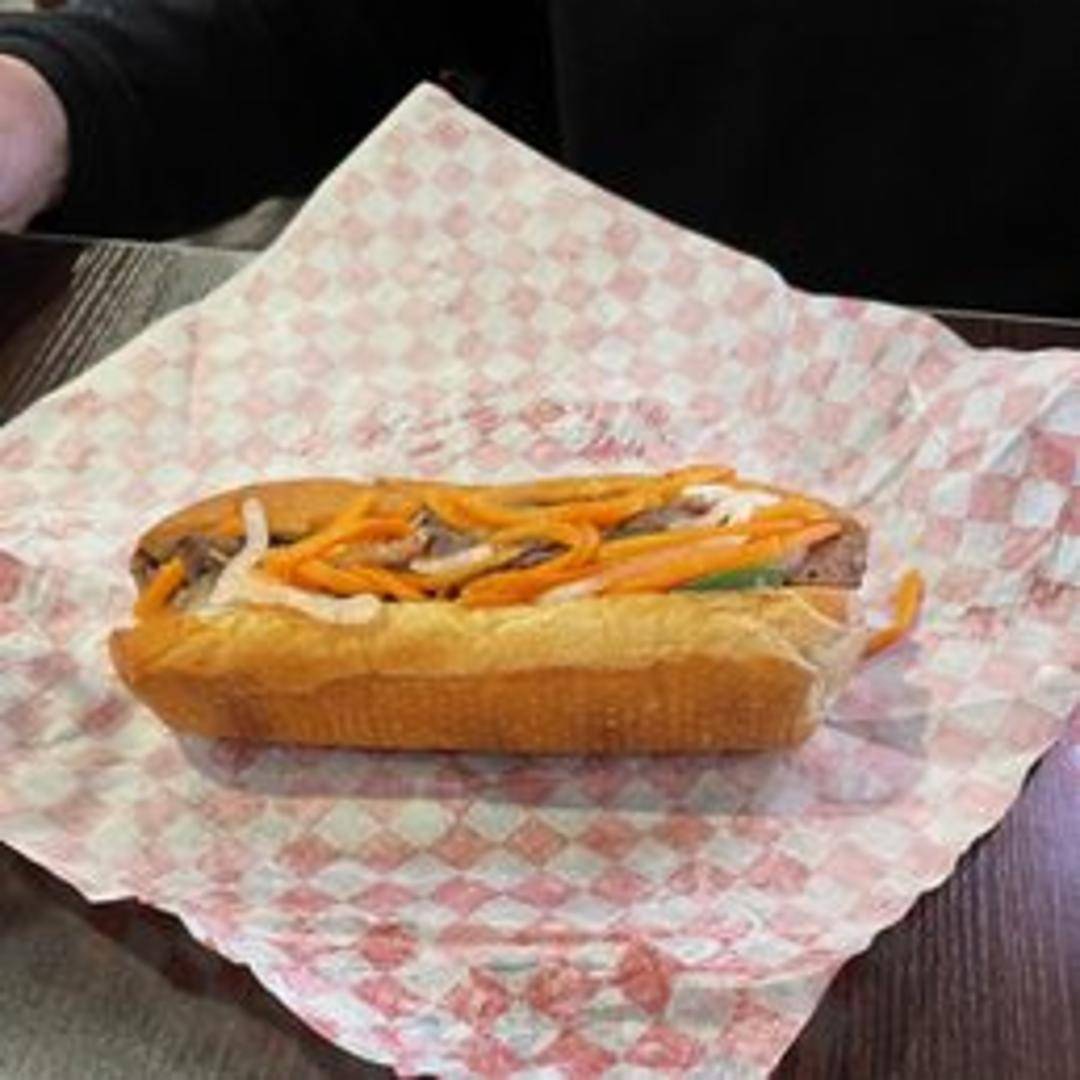 A Vietnamese sandwich featuring grilled pork, pickled vegetables, cilantro, jalapeños, and mayonnaise on a crispy baguette.
