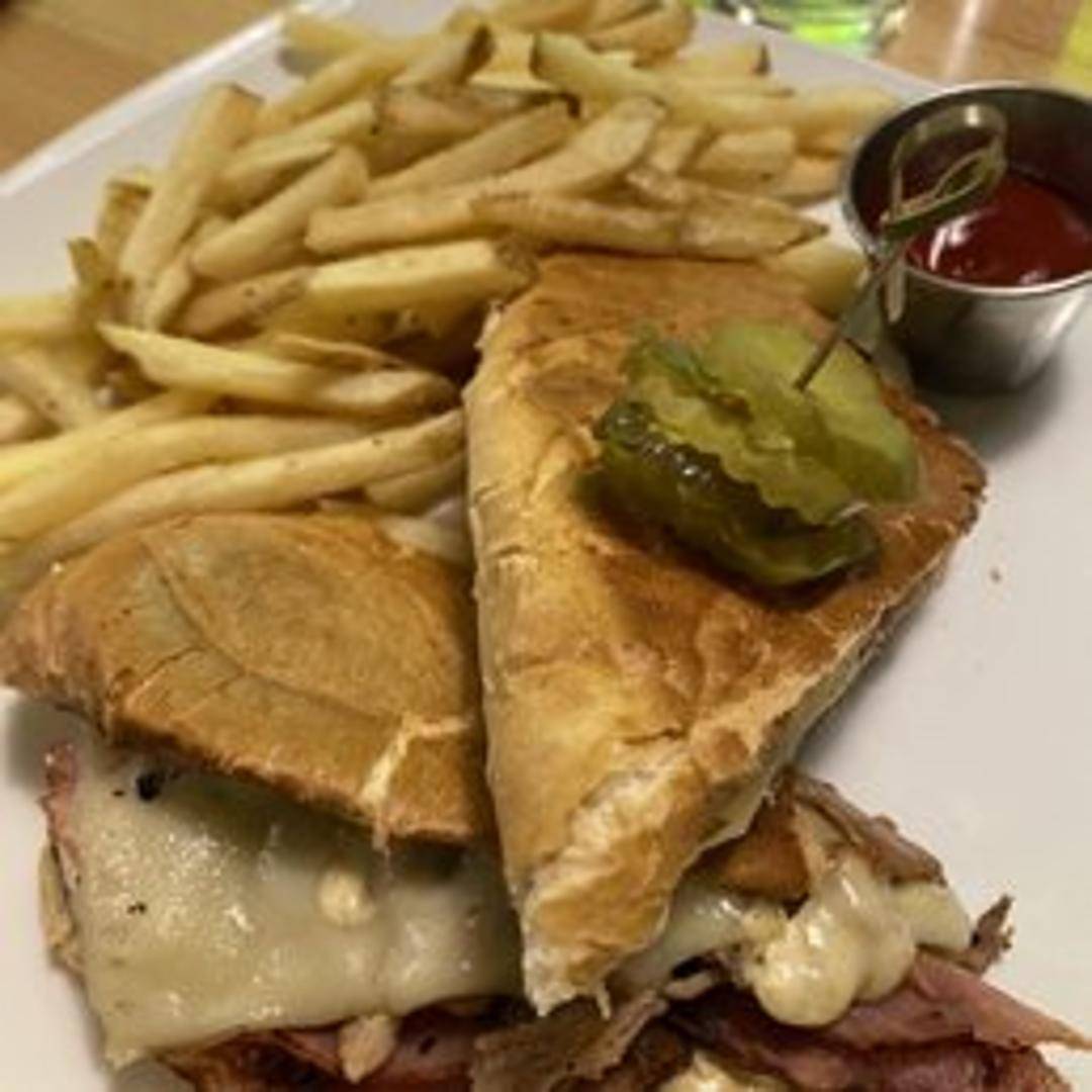 Slow-roasted pork, ham, Swiss cheese, pickles, and mustard pressed between Cuban bread until golden brown and crispy.