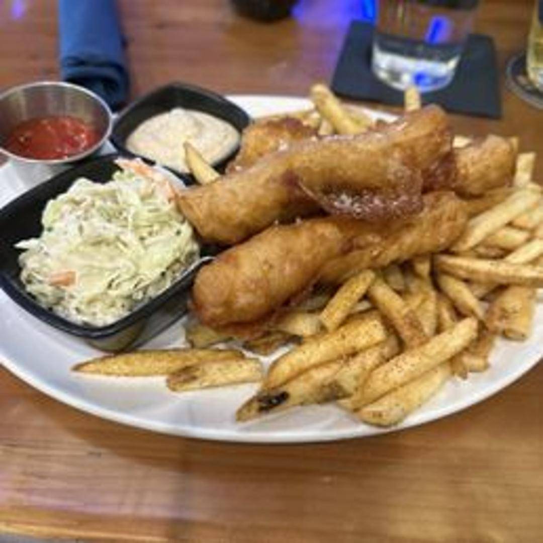 Crispy, beer-battered cod fillets served with golden-brown French fries, tartar sauce, and lemon wedges.