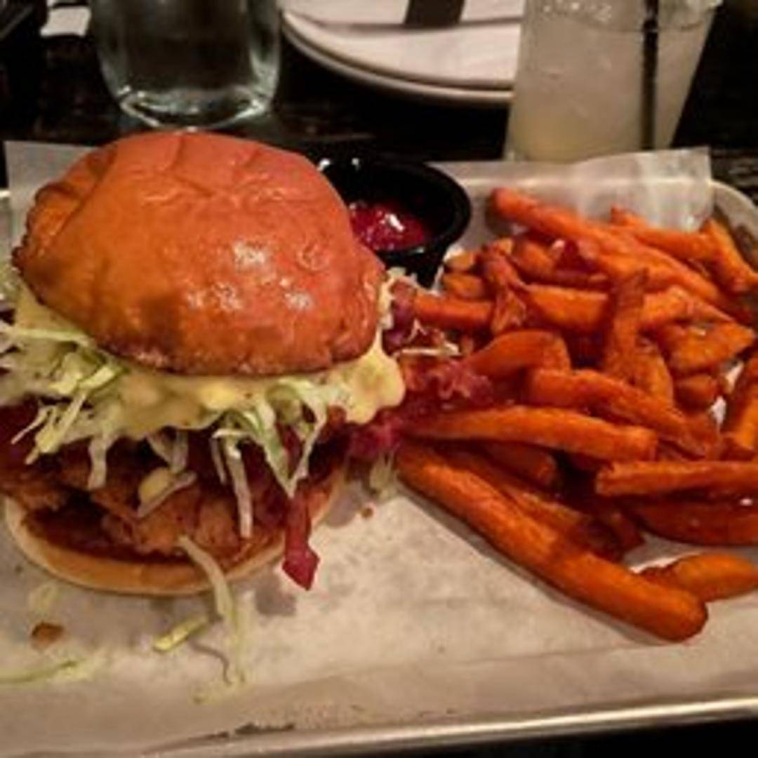 Crispy fried chicken breast served on a toasted bun with lettuce, tomato, pickles, and a signature sauce.