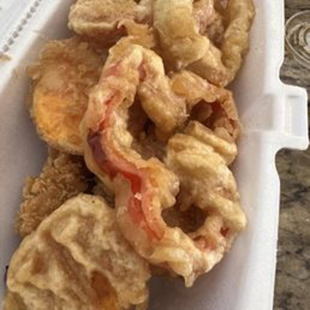 Light and crispy shrimp tempura featuring succulent shrimp coated in a delicate, airy batter. The shrimp are deep-fried to a golden brown perfection, resulting in a satisfying crunch. Served with a light and flavorful tentsuyu dipping sauce, typically made with dashi, soy sauce, and mirin, and grated daikon radish.