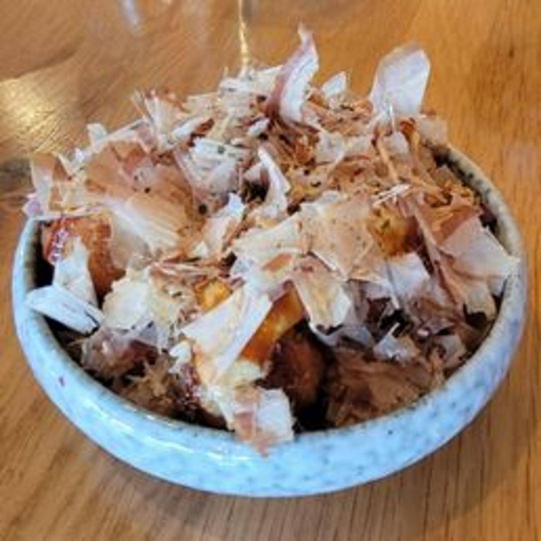 Classic Japanese street food: crispy on the outside, creamy on the inside. These savory octopus balls are made with a wheat flour-based batter, filled with diced octopus, tempura scraps, pickled ginger, and green onion. Topped with takoyaki sauce (similar to Worcestershire sauce), Japanese mayonnaise, dried seaweed flakes (aonori), and bonito flakes (katsuobushi). A must-try appetizer!