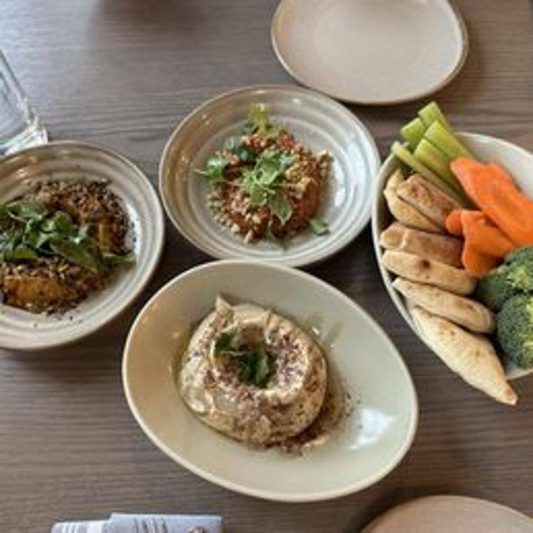 Roasted red pepper dip made with walnuts, breadcrumbs, pomegranate molasses, and spices, served with warm pita bread.