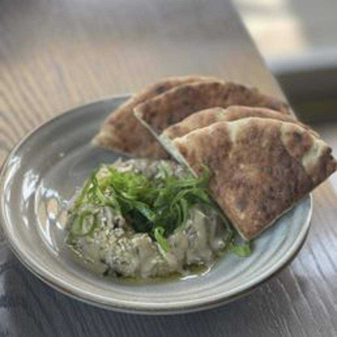 Smoked eggplant dip blended with tahini, lemon juice, and garlic, served with warm pita bread.