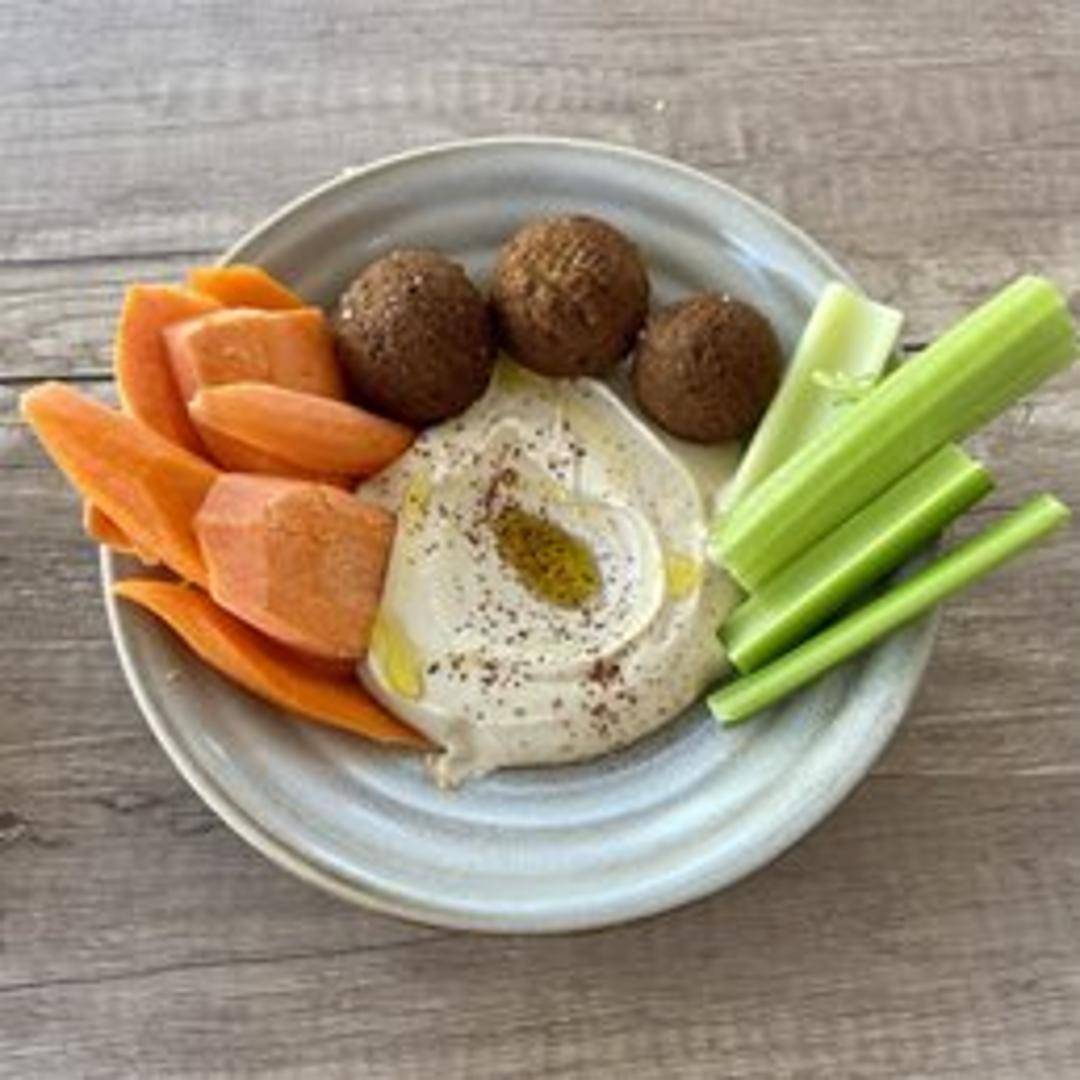 Creamy hummus topped with crispy falafel balls, drizzled with tahini sauce, and served with warm pita bread.