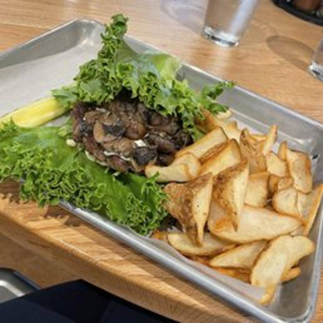 A flavorful burger featuring sautéed wild mushrooms, melted Swiss cheese, and a hint of garlic aioli. Served on a toasted bun.