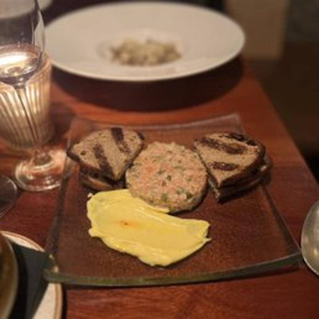Fresh, diced salmon mixed with classic tartare ingredients, such as capers, shallots, and herbs. Served with crostini.