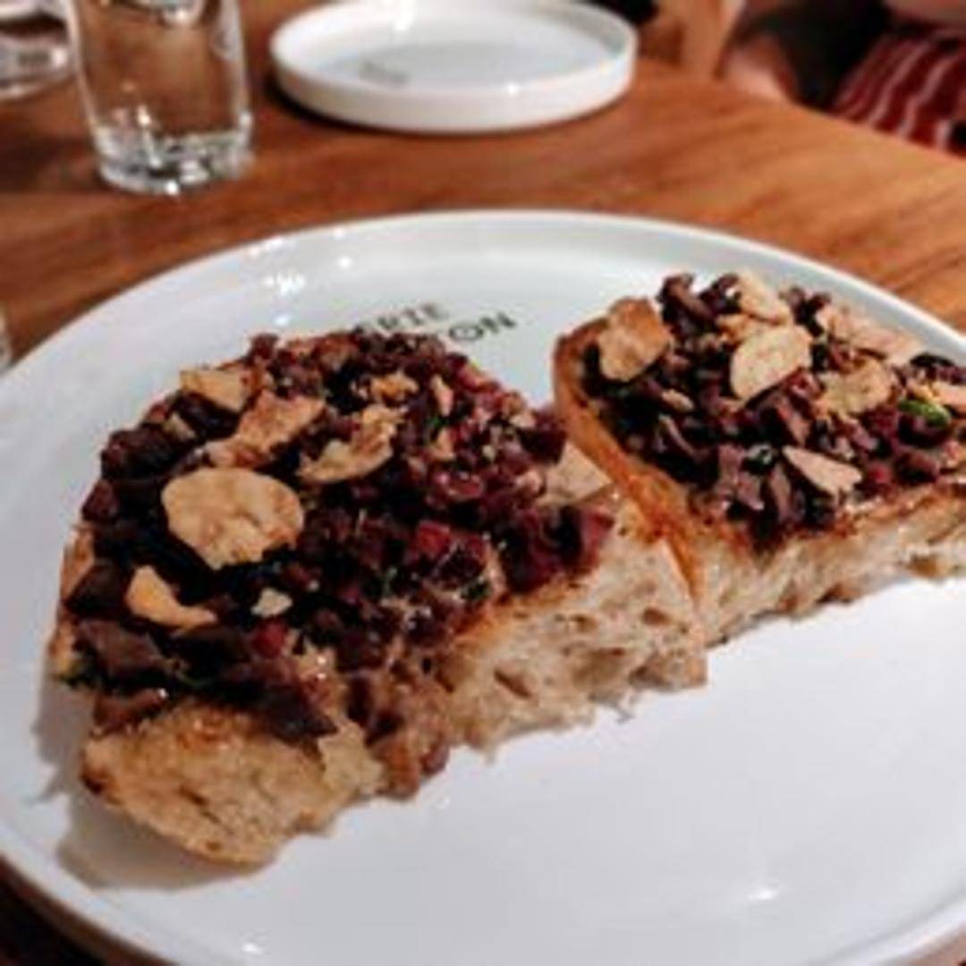 Seared duck hearts, offering a rich and savory flavor with a slightly chewy texture. Often served with a complementary sauce or garnish.