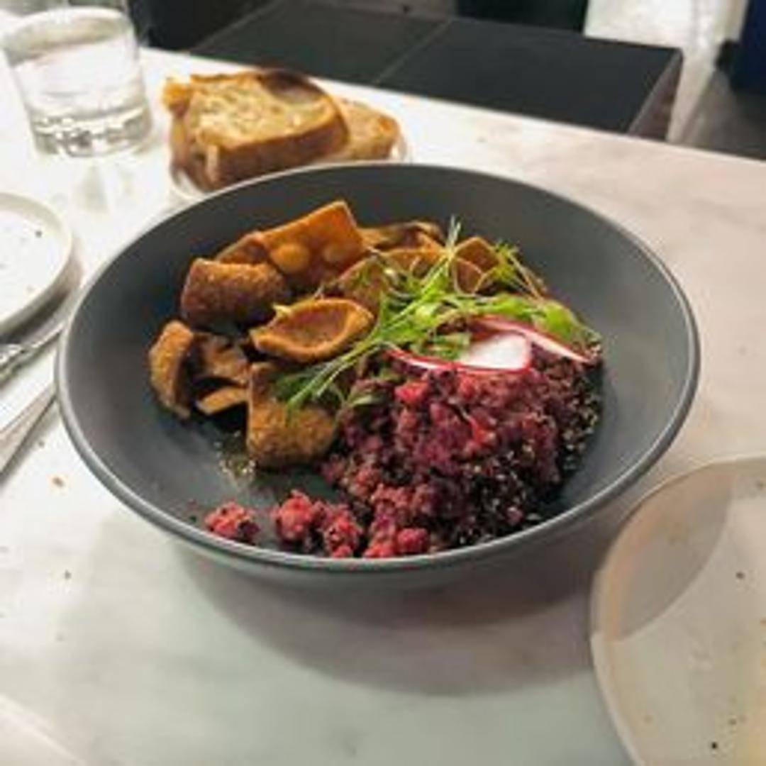 Finely chopped raw beef, seasoned with classic tartare ingredients like shallots, capers, and Dijon mustard. Topped with a raw egg yolk and served with toasted baguette slices.