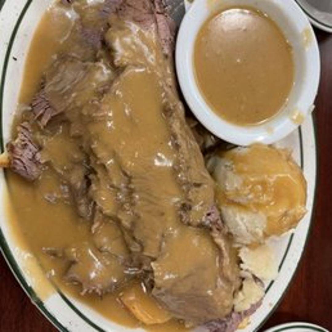 Tender, slow-cooked brisket piled high on your choice of bread, served open-faced and smothered in a rich, savory gravy.