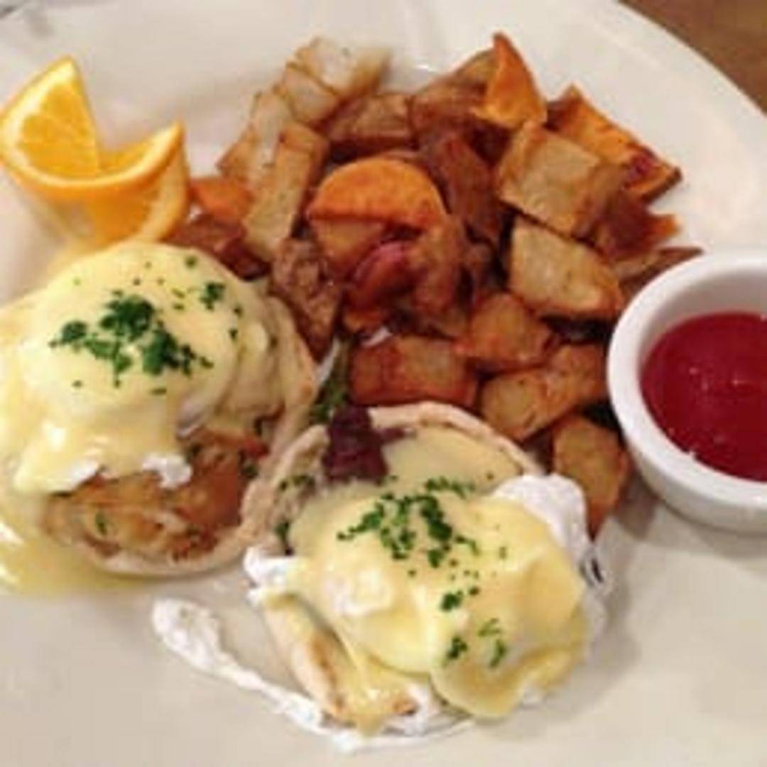 Toasted English muffin topped with tender grilled steak and succulent crab cakes, poached eggs, and hollandaise sauce. Served with a side of breakfast potatoes.