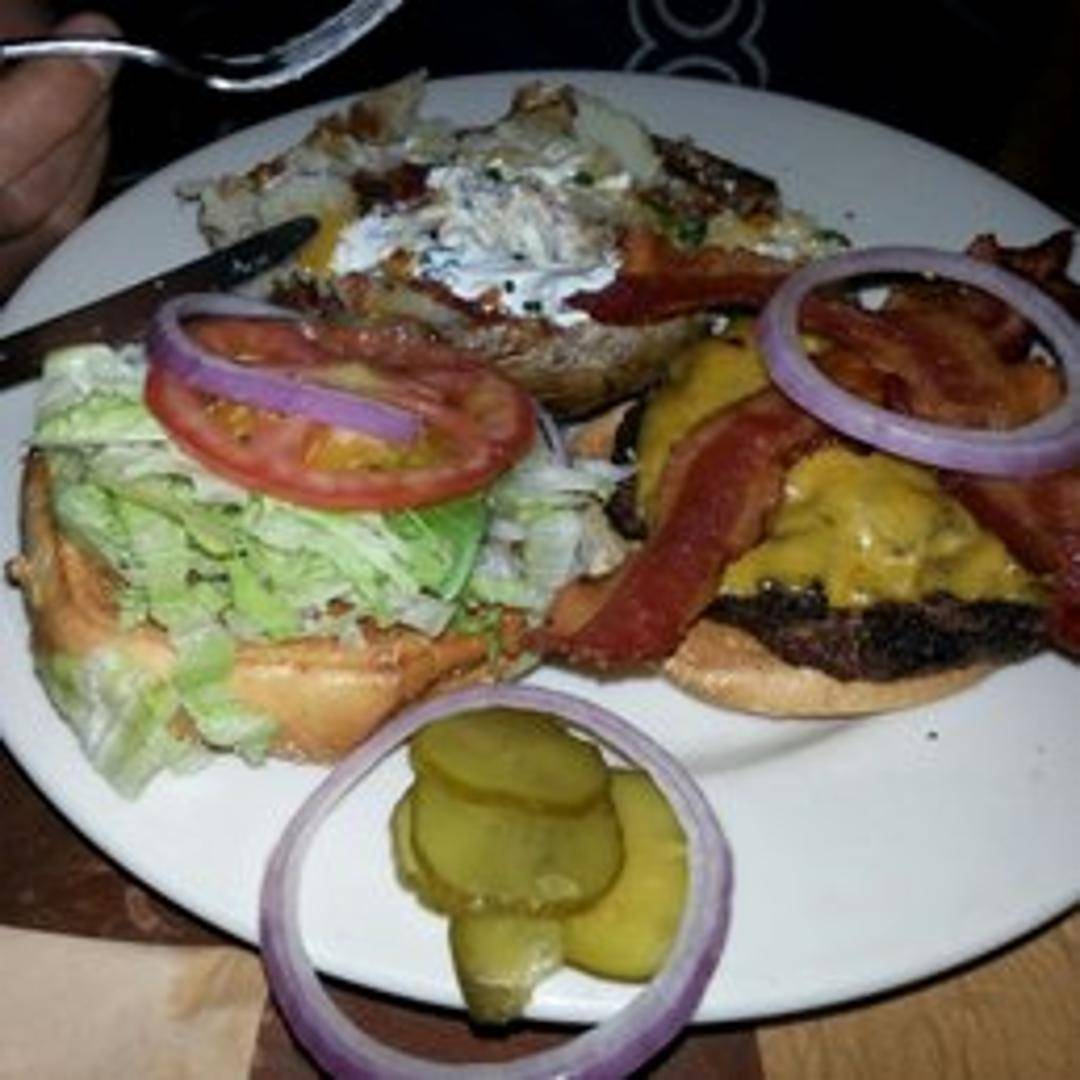 A large baked potato, overflowing with melted cheddar cheese, crispy bacon bits, sour cream, and chives. Served with a side of butter.