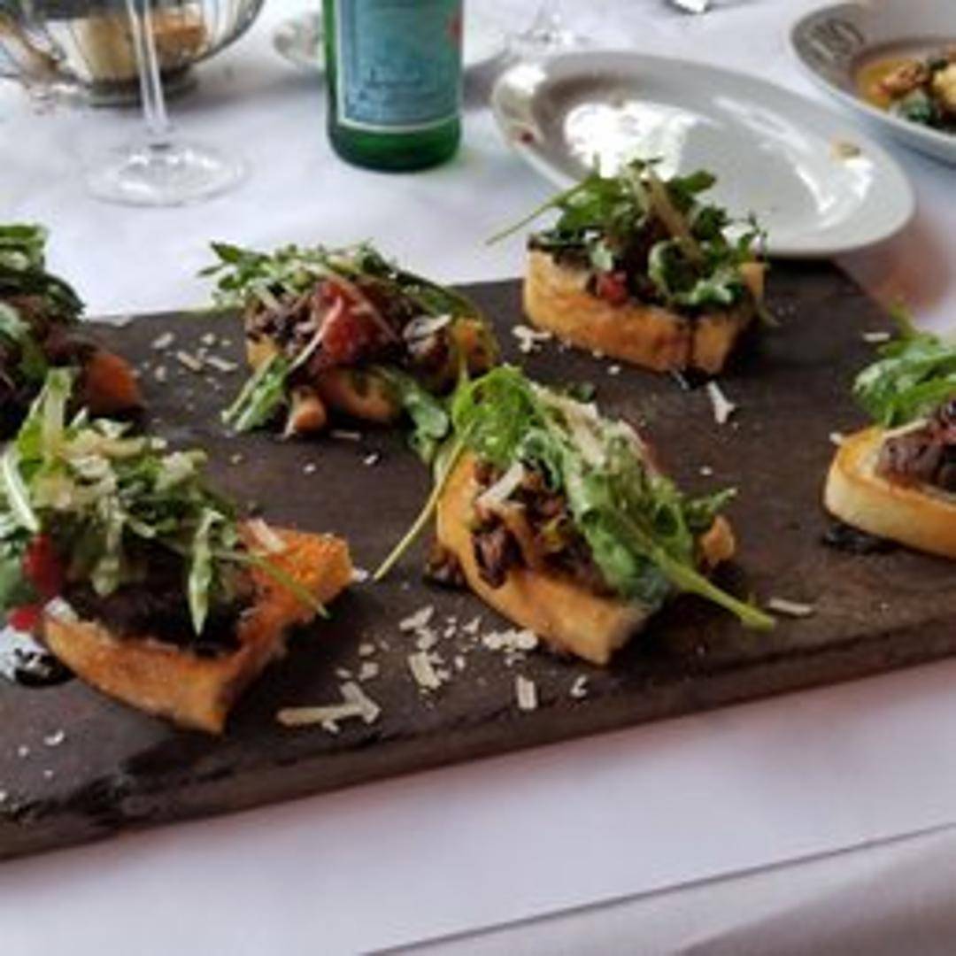 A gourmet twist on a traditional favorite, this appetizer features toasted artisan bread topped with tender, seasoned slices of steak, complemented by fresh diced tomatoes, garlic, herbs, and a balsamic glaze.