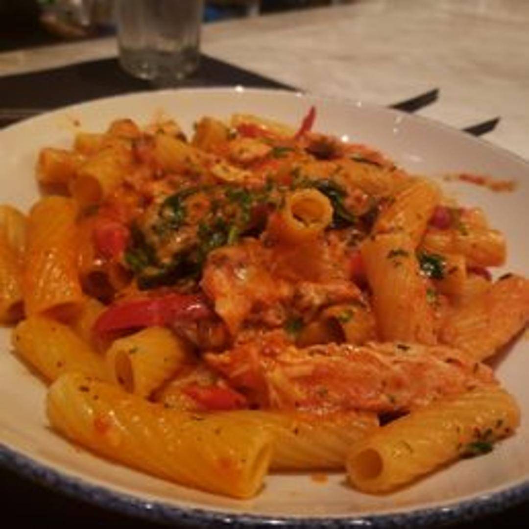 A signature Brio pasta creation featuring al dente pasta tossed in a rich and creamy sauce, artfully blended with roasted red peppers, a hint of garlic, and Parmesan cheese for a deeply satisfying and unique flavor.