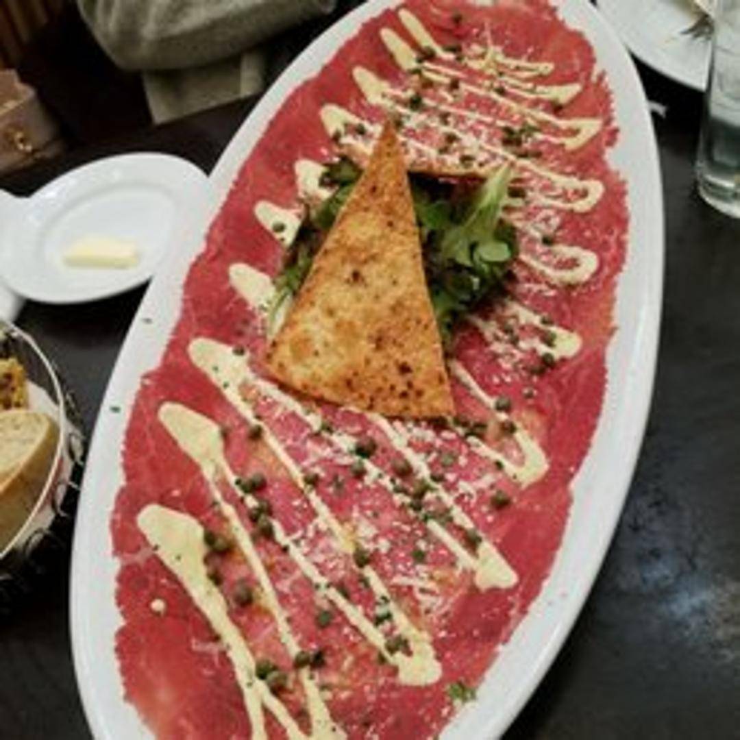 A delicate and refined Italian appetizer featuring paper-thin slices of raw beef tenderloin, artfully arranged and typically garnished with fresh arugula, capers, shaved Parmesan cheese, and a light drizzle of lemon-infused olive oil.