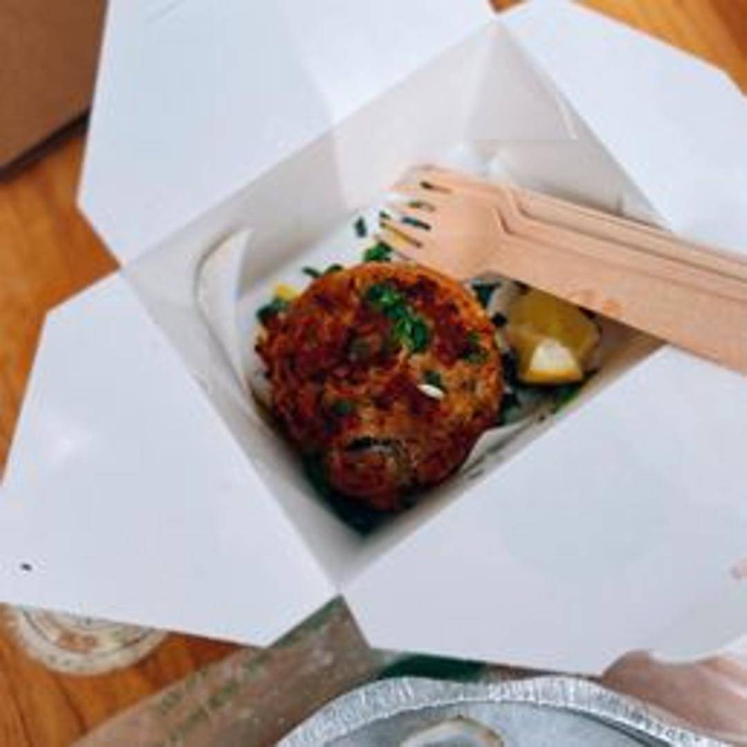A Maryland-style crab cake featuring generous chunks of sweet crab meat, delicately seasoned and bound together. Pan-fried or broiled to a golden brown, offering a delightful combination of textures and flavors. Served with a side of tartar sauce.