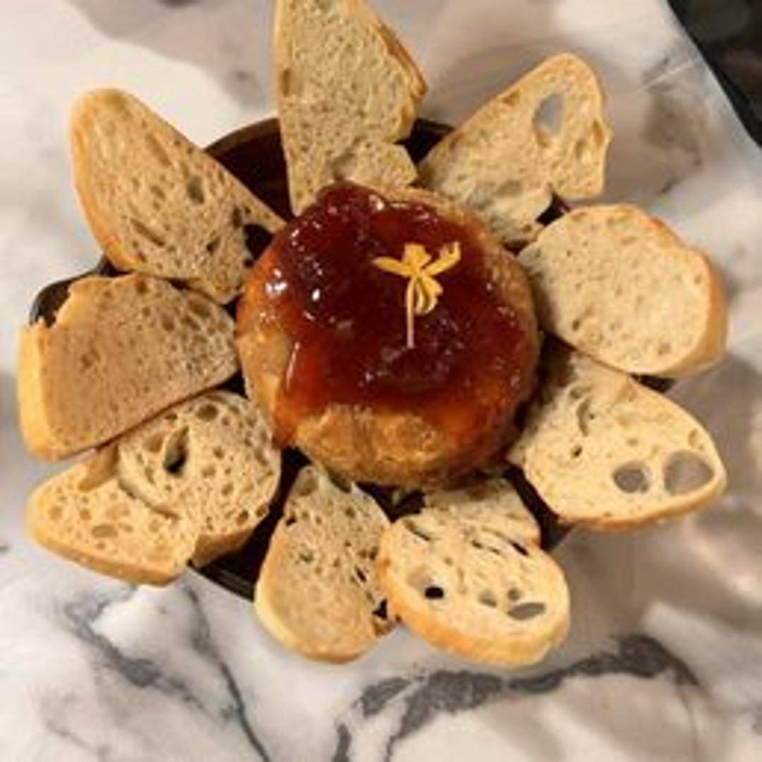 Warm and creamy brie cheese baked until melted and bubbly. Served with toasted baguette slices, fruit preserves, and nuts.