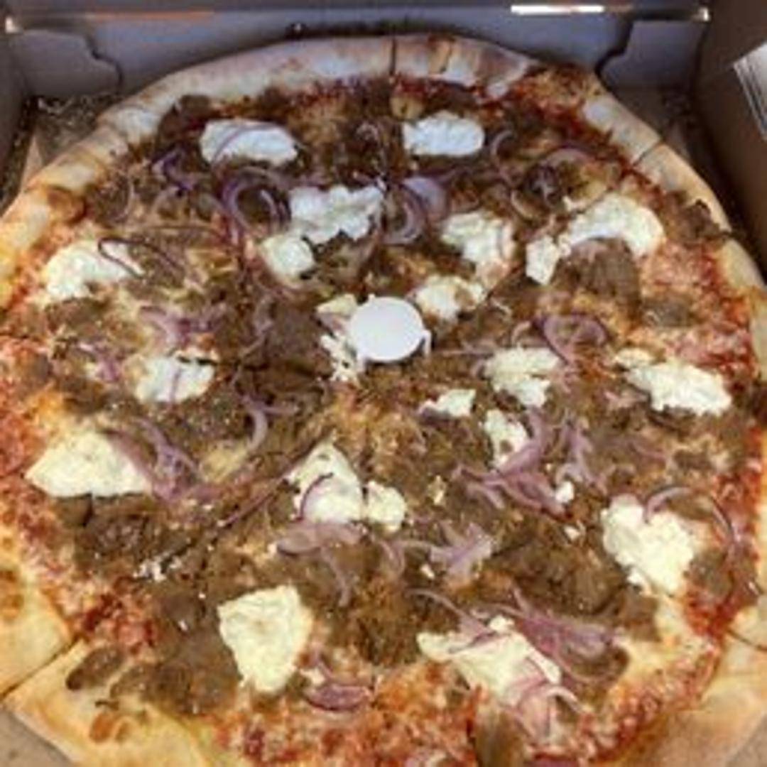 A hearty pizza with a thick crust, generous layer of tomato sauce, mozzarella cheese, seasoned ground beef, mushrooms, onions, green peppers, and black olives. A true New York style experience.