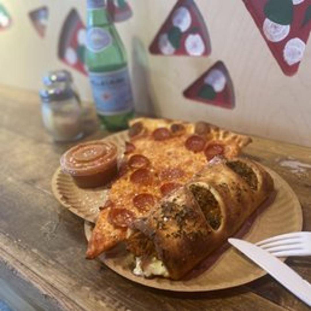 A rolled pizza dough filled with mozzarella cheese, your choice of pizza toppings (typically meats like pepperoni, ham, and salami, and vegetables), and baked until golden brown. Served with a side of marinara sauce for dipping.