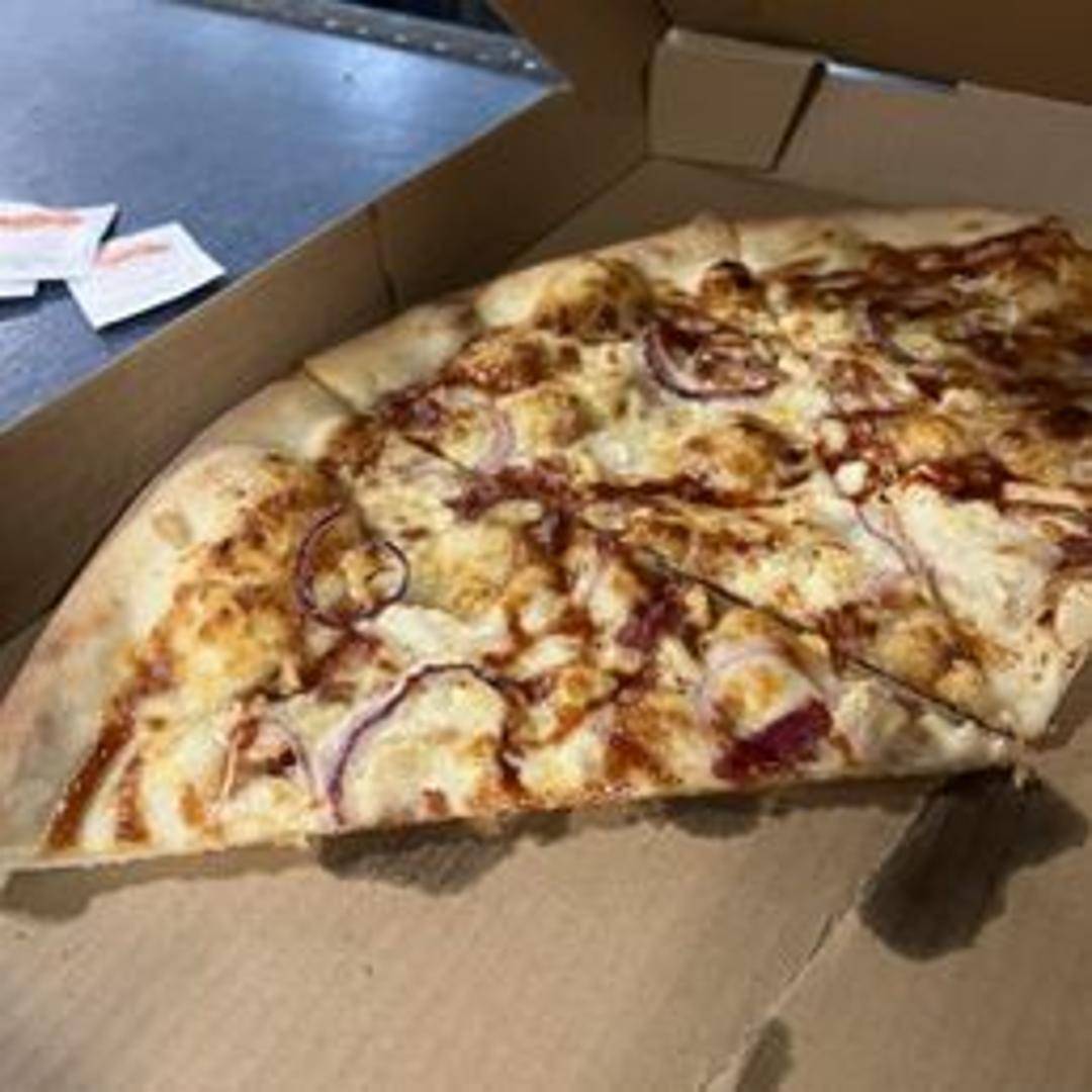 A large, 18-inch pizza featuring a sweet and smoky BBQ sauce base, topped with grilled chicken, red onions, and a blend of melted cheeses. A tangy and satisfying flavor combination.