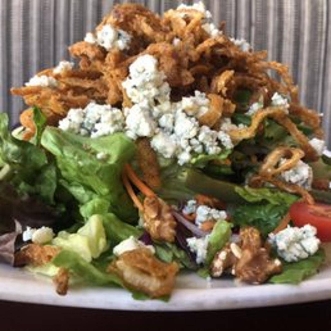 A hearty salad featuring grilled tri-tip steak, crisp romaine lettuce, tomatoes, red onion, crumbled blue cheese, and a creamy horseradish dressing.