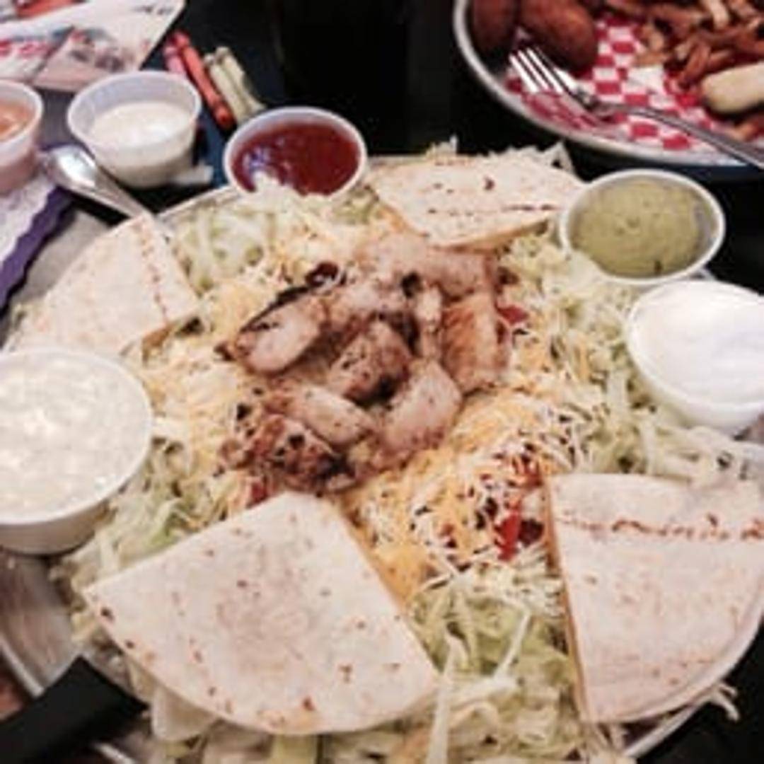 A hearty salad served in a crispy tortilla shell, filled with seasoned ground beef, shredded lettuce, diced tomatoes, onions, cheese, sour cream, and your choice of salsa.