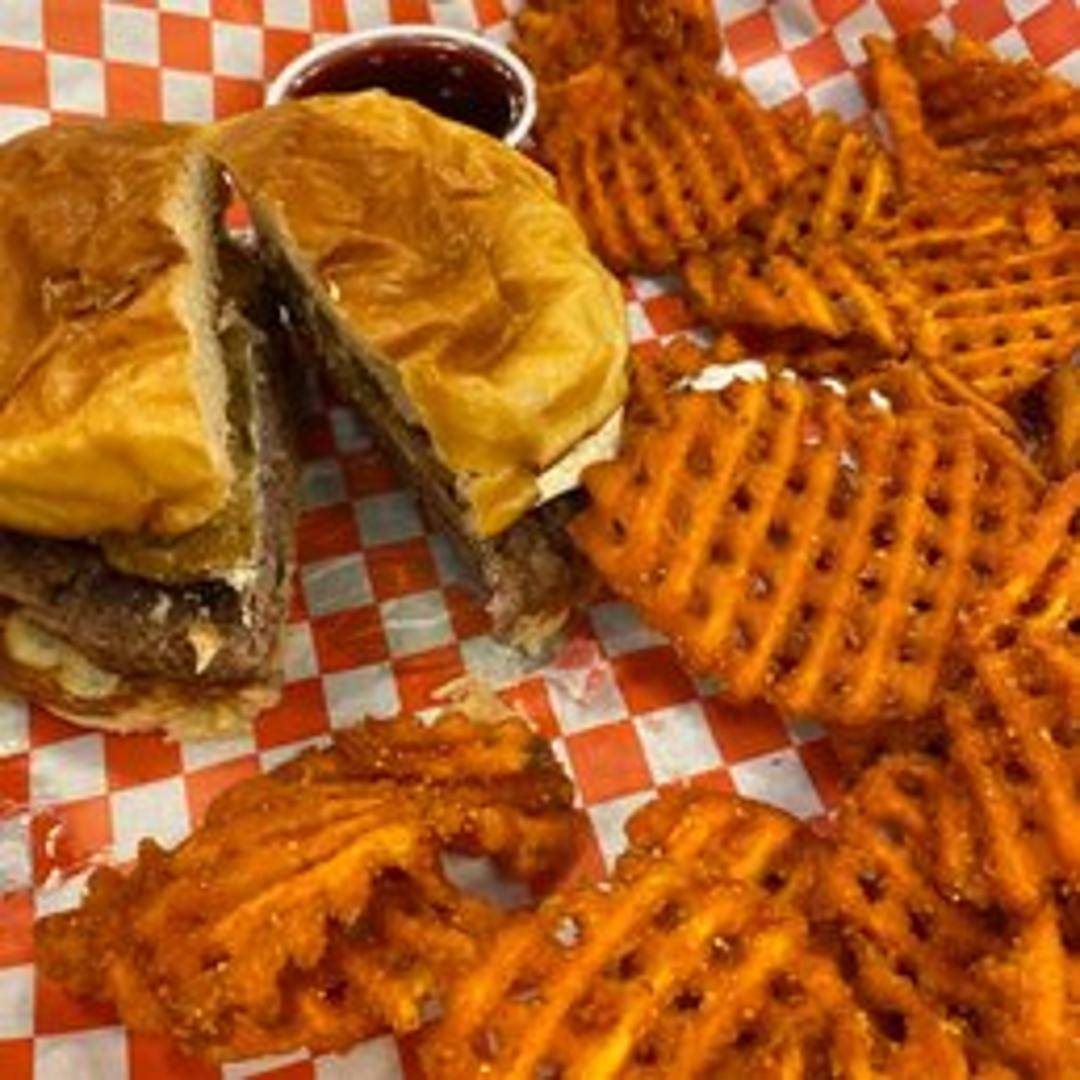 A monstrous burger piled high with two beef patties, swiss cheese, bacon, fried egg, onion rings, lettuce, tomato, pickles, and our special sauce on a toasted brioche bun.