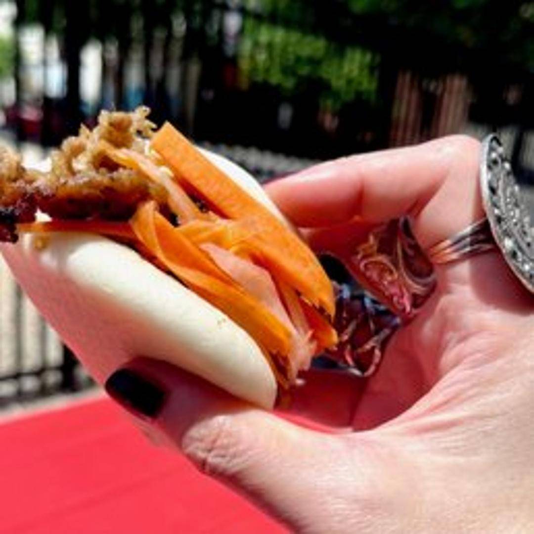 Steamed, fluffy bao buns filled with savory, seasoned Vietnamese-style pork. Often includes pickled vegetables, fresh herbs like cilantro, and a touch of hoisin sauce or other flavorful condiments for a balanced sweet and savory experience.