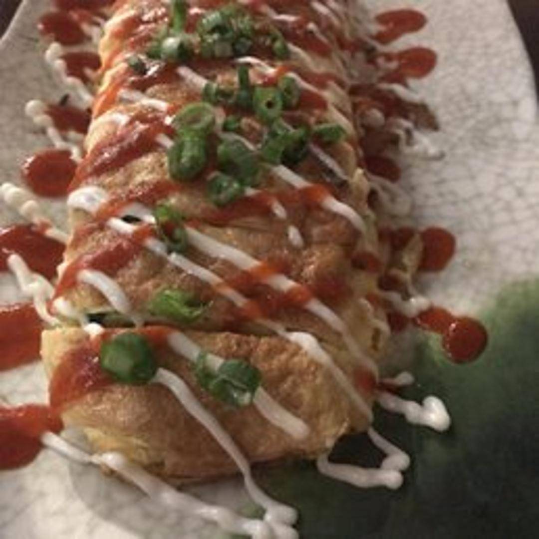 A classic Korean rolled omelet, meticulously prepared by layering thin sheets of cooked egg, often mixed with finely chopped colorful vegetables like carrots and green onions. It's gently rolled into a thick cylinder, then sliced into bite-sized pieces, presenting a soft, fluffy texture and a mild, savory flavor, perfect as a side dish or snack.