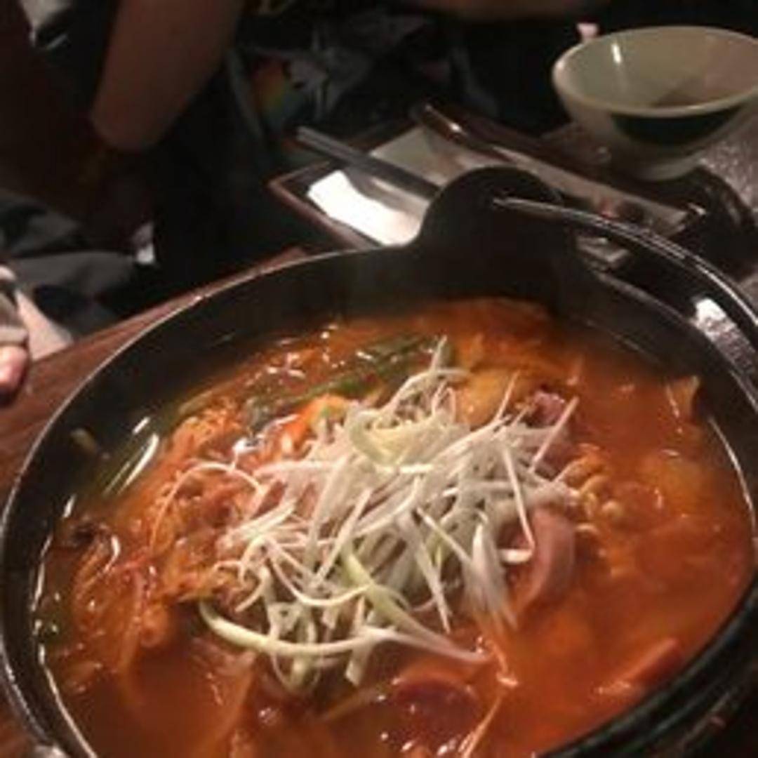A hearty and iconic Korean 'Army Stew' known for its rich, spicy, and savory broth. This communal dish features an exciting mix of ingredients including spam, sausages, baked beans, kimchi, tofu, mushrooms, and ramen noodles, all simmered together in a fiery gochujang-based broth. A comforting and satisfying meal, perfect for sharing.