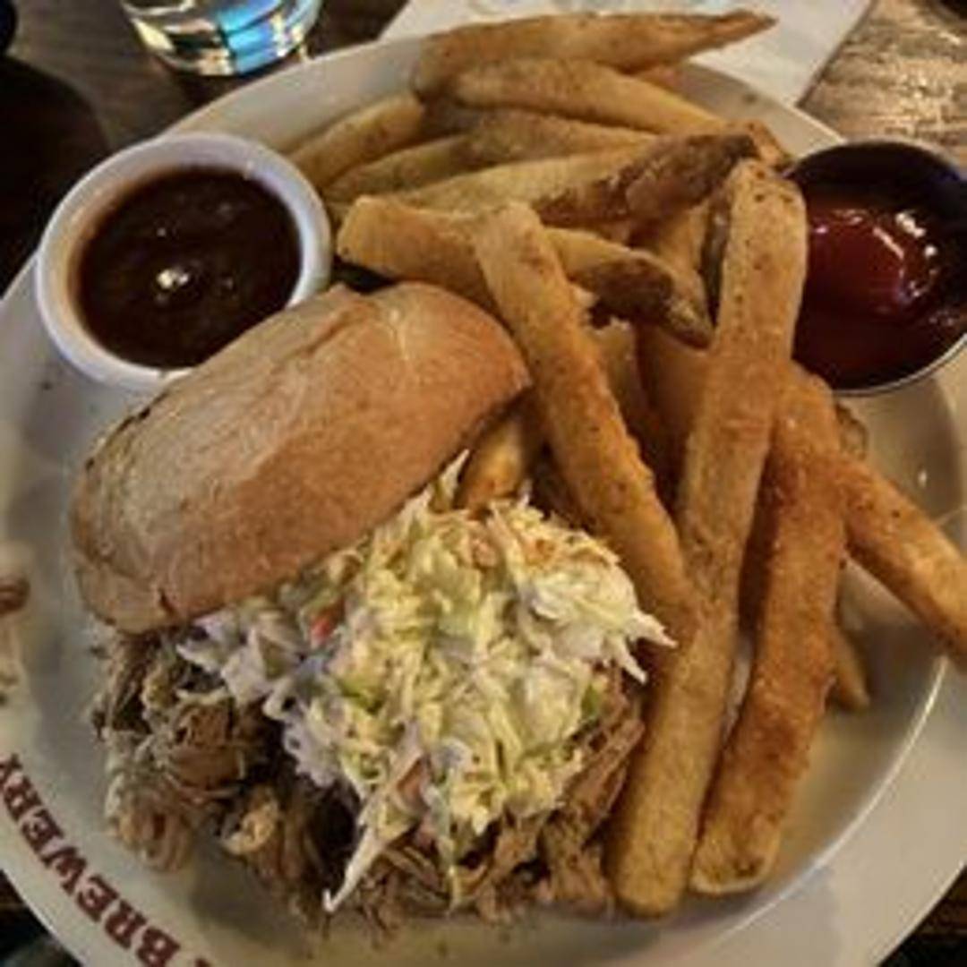 Slow-smoked pulled pork tossed in a tangy BBQ sauce, piled high on a toasted bun, and topped with coleslaw.