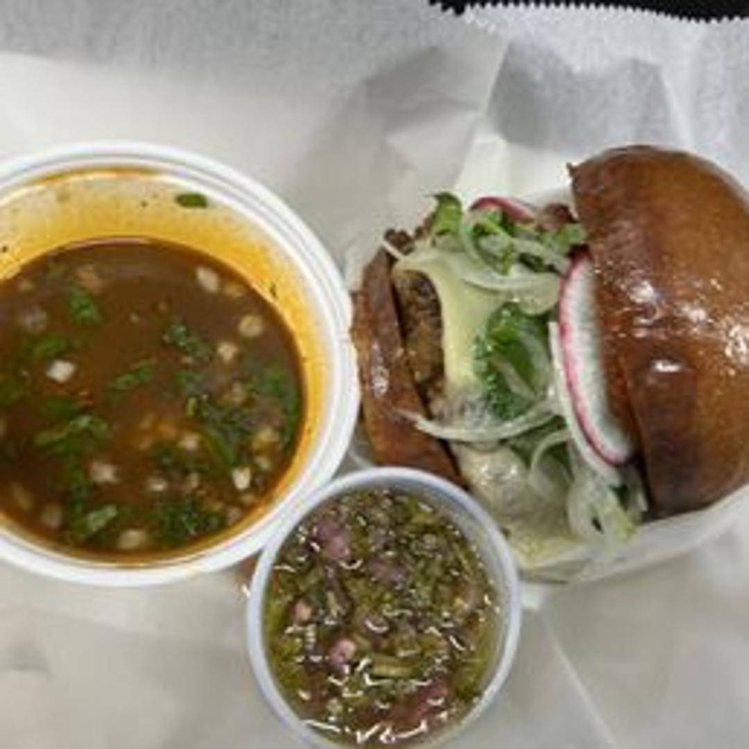 A juicy burger featuring tender, slow-cooked birria beef, melted cheese, onions, and cilantro served on a toasted bun with a side of flavorful consommé for dipping.