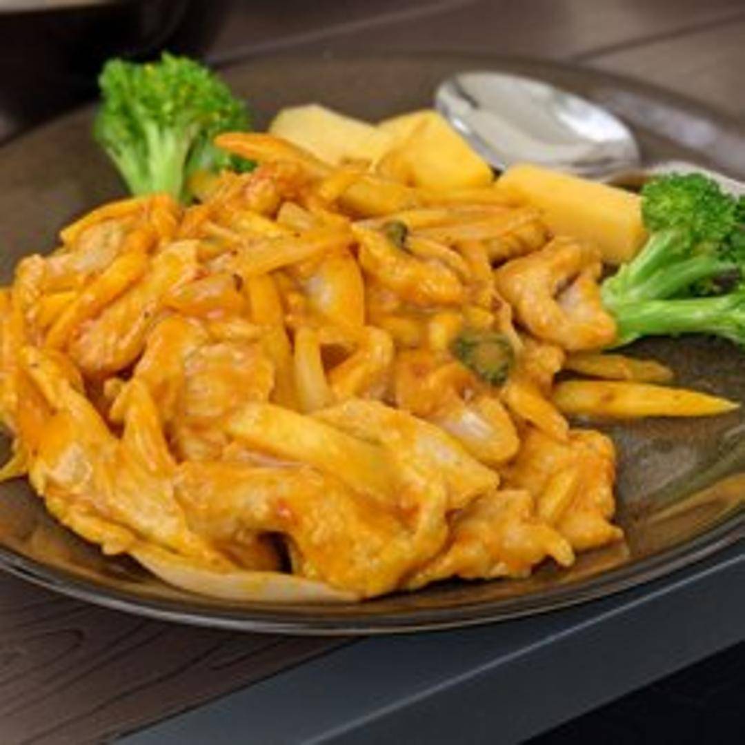Tender chicken cooked in a sweet and tangy mango sauce. A flavorful dish that balances the richness of chicken with the tropical sweetness of mango.