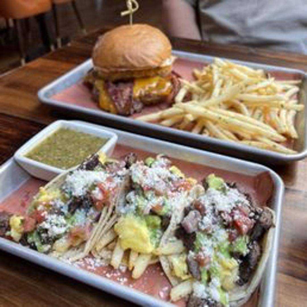 A burger piled high with toppings designed to cure a hangover, such as bacon, fried egg, cheese, and special sauce. Served with fries.