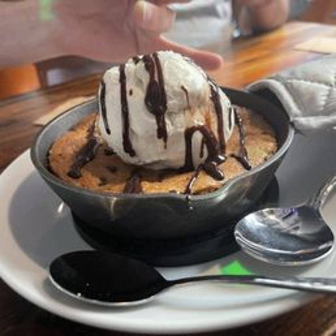 A hearty, savory dish served in a cast iron skillet. Typically contains a mix of eggs, potatoes, vegetables, cheese, and a choice of meat.